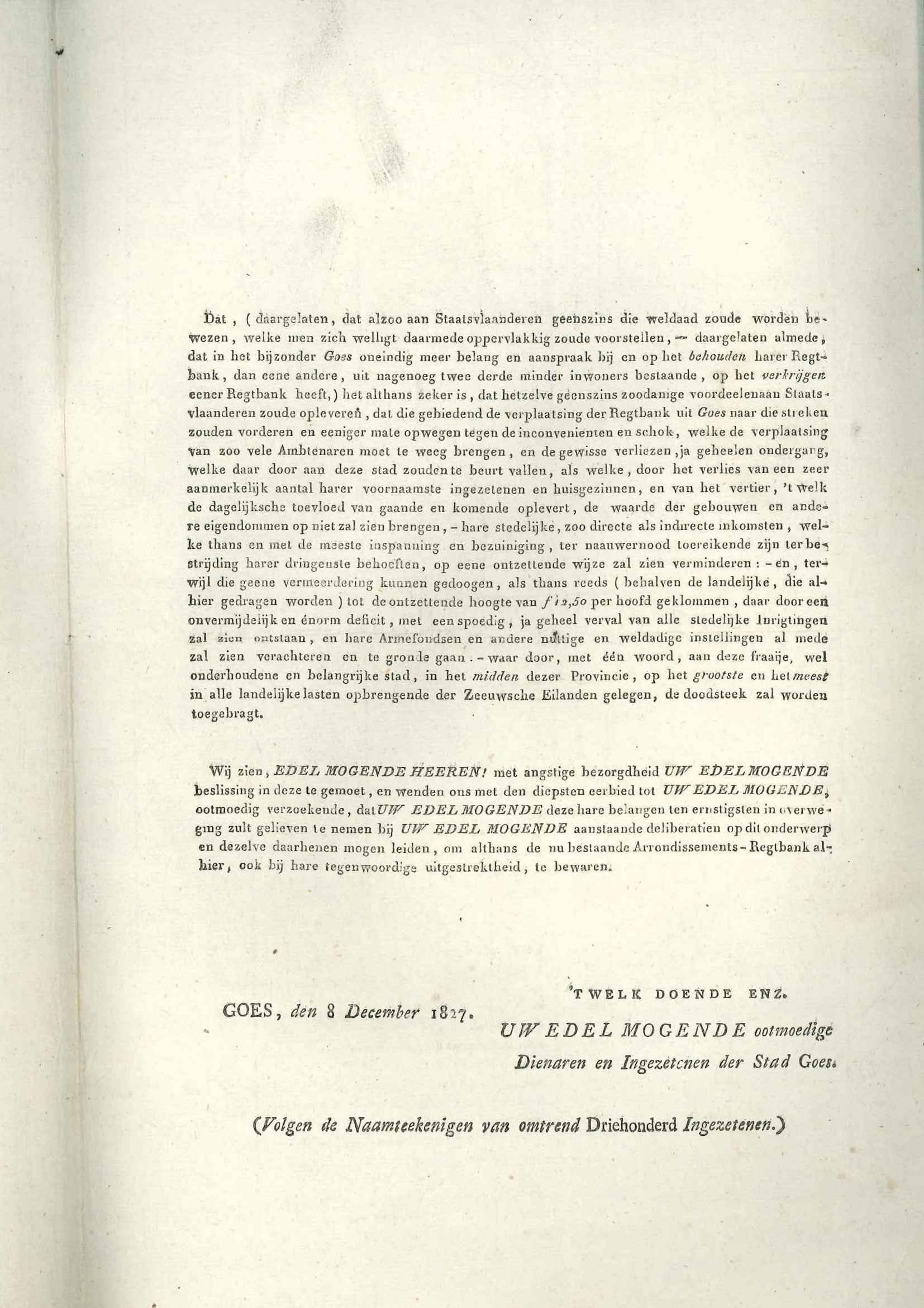 Het Stadsbestuur overweegt op de 1e december 1827 dat volgens sommige openbare nieuwspapieren en bijzondere geruchten bij de door Zijne Majesteit de Koning aan de Tweede Kamer der Staten Generaal ingediende Wet omtrent de verdeling van het Rijk in judiciële arrondissementen wordt voorgesteld om de provincie Zeeland in drie arrondissementen te verdelen. Hiervan zouden dan de steden Middelburg, Zierikzee en Axel de hoofdplaatsen zijn. Als deze geruchten waar zijn, zou de thans in Goes gevestigde arrondissementrechtbank verloren gaan. De gevolgen daarvan zouden voor de stad schadelijk en ruineus zijn. Besloten wordt de bezwaren bij een eerbiedig adres over te brengen aan Zijne Majesteit de Koning.